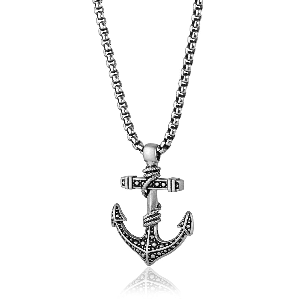 Beaded design stainless steel anchor pendant on a stainless steel round box chain measuring 22 inches