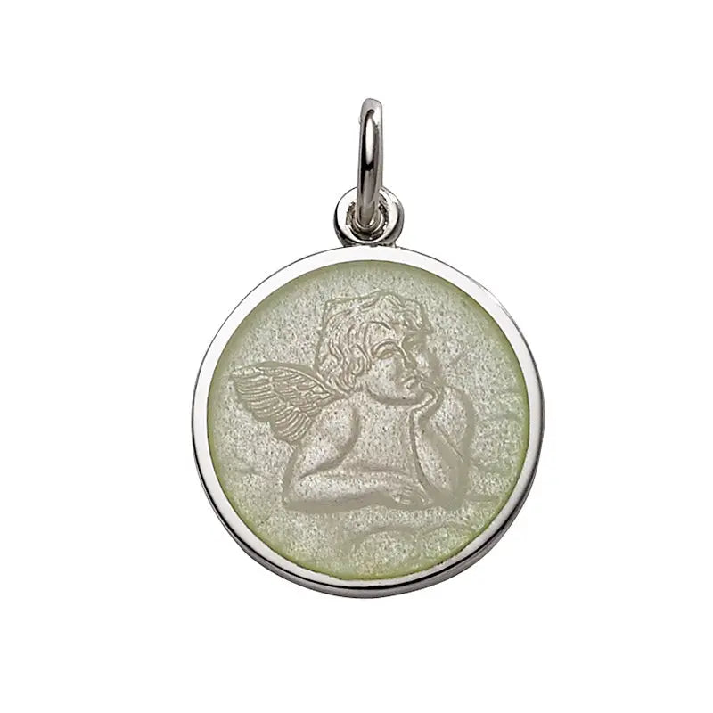 White enameled sterling silver cherub angel medal with a 9/16 inch diameter