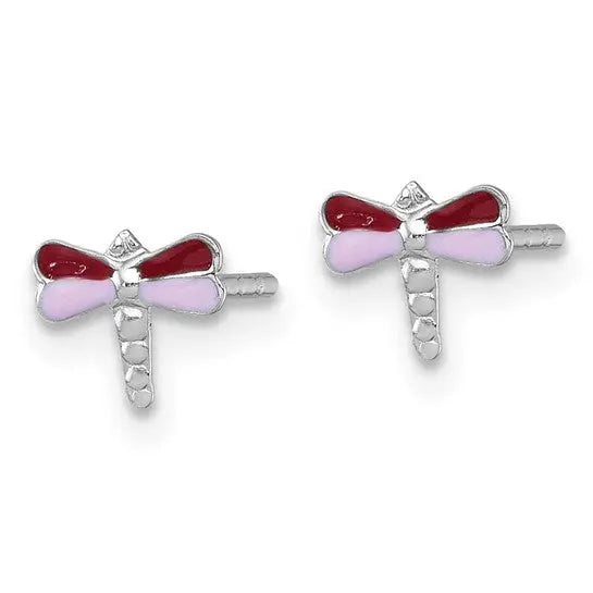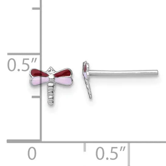 Rhodium plated sterling silver enamelled dragonfly earrings with post and friction back closure.