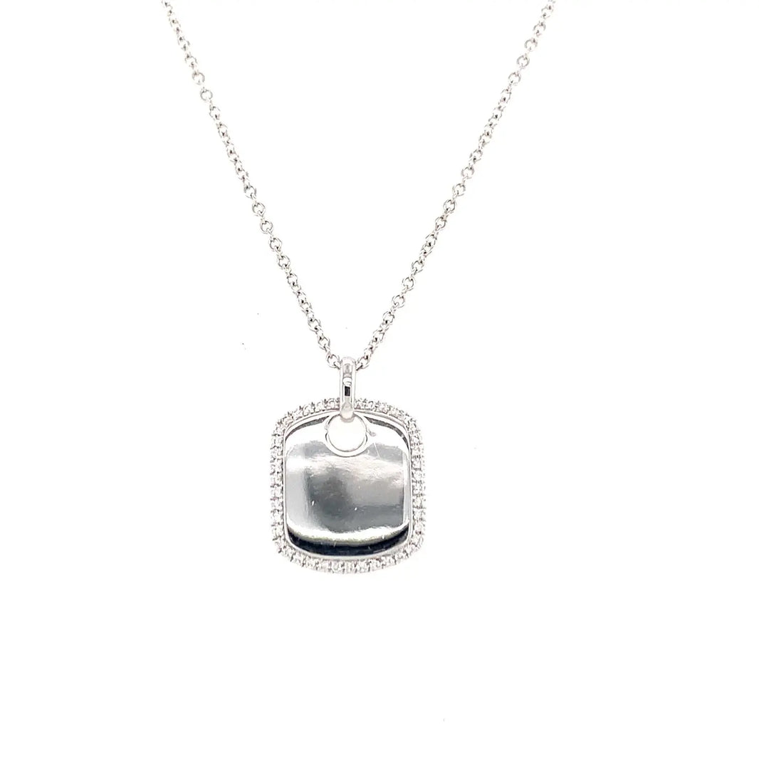 18 karat white gold dog tag diamond necklace set with 42 round brilliant cut diamonds having a total weight of 0.10 carats clarity: VS2 color: G/H with a 18 karat white gold adjustable cable link chain.