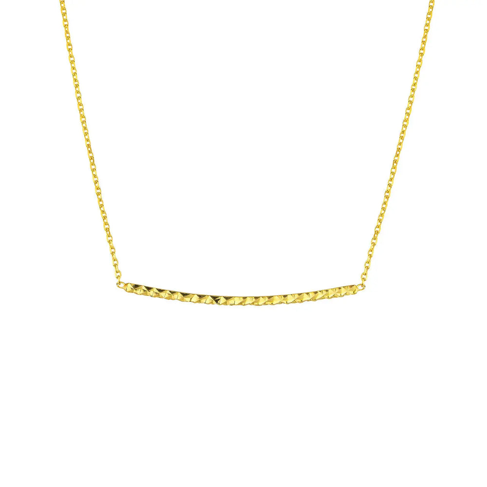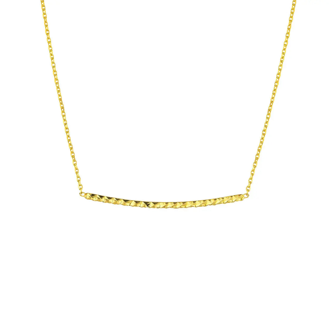 Gold plated curved diamond cut bar pendant on an adjustable gold plated cable link chain.Great for layering or wearing by itself.