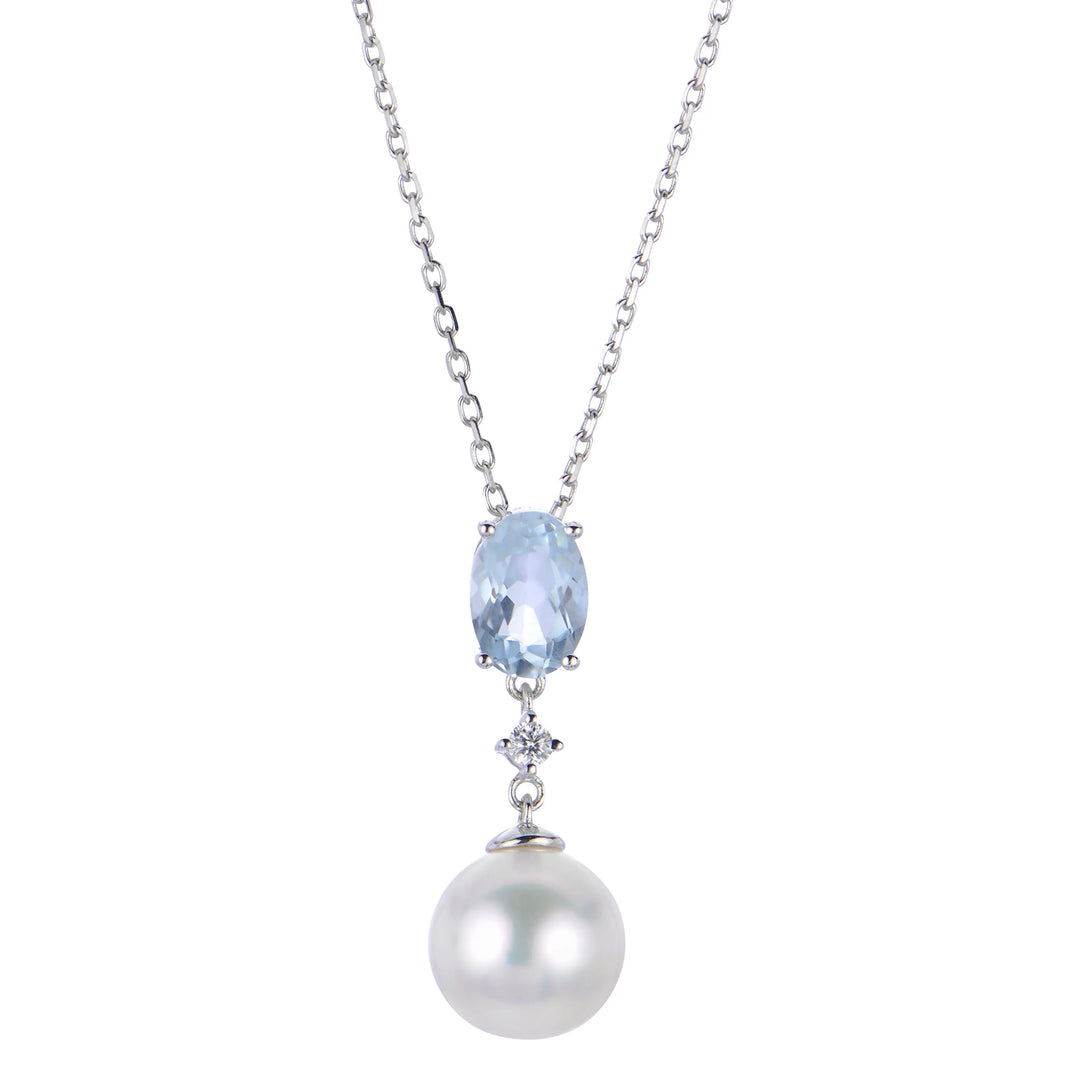 14 karat white gold necklace wit a 8-8.5 mm "AA" freshwater cultured pearl and aquamarine and diamond drop on a cable chain measuring 18 inches in length.
