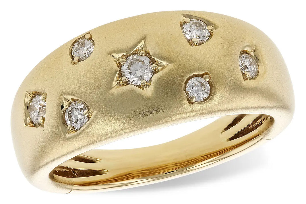 This luxurious 14 karat yellow gold star ring is elegantly adorned with a satin finish and 7 round brilliant cut diamonds, totaling 0.25 carats in weight. Its finger size is 7.