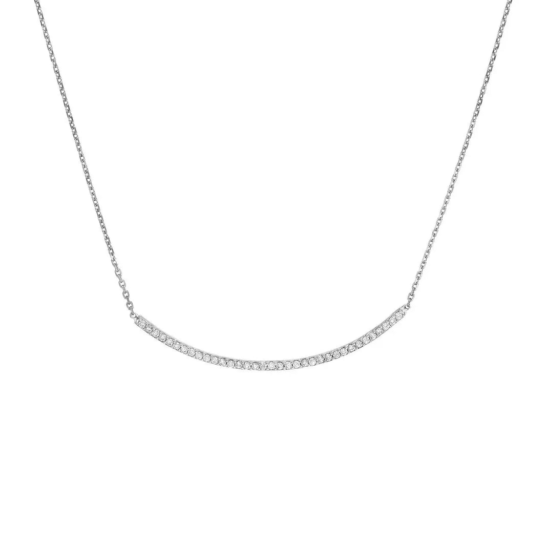 Sterling silver necklace with cubic zirconias in a curved bar measuring 18 inches in length.