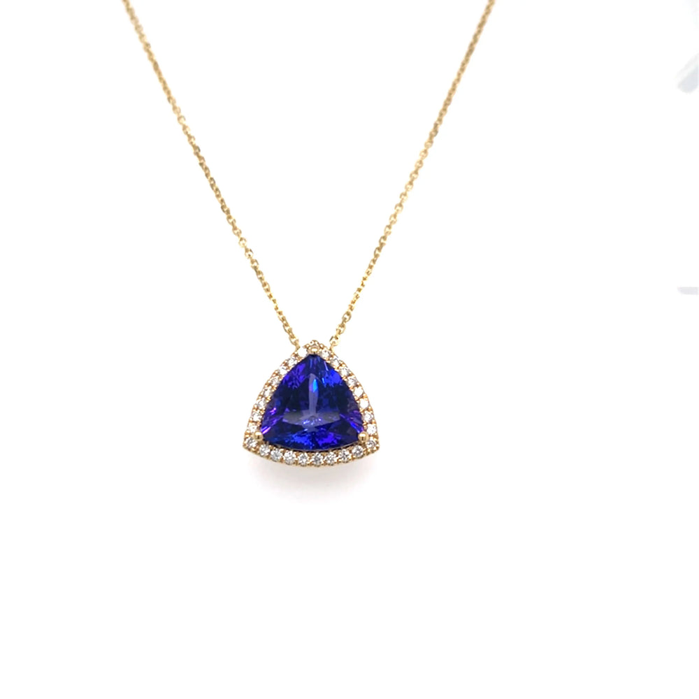 Crafted in luxurious 14kt yellow gold, this exquisite tanzanite and diamond pendant boasts a radiant trillion cut tanzanite, totaling 4.42 carats, surrounded by 27 round brilliant diamonds weighing 0.22 carats in total. Its timeless elegance and sophistication make it a must-have for any discerning jewelry collector. Chain sold separately.