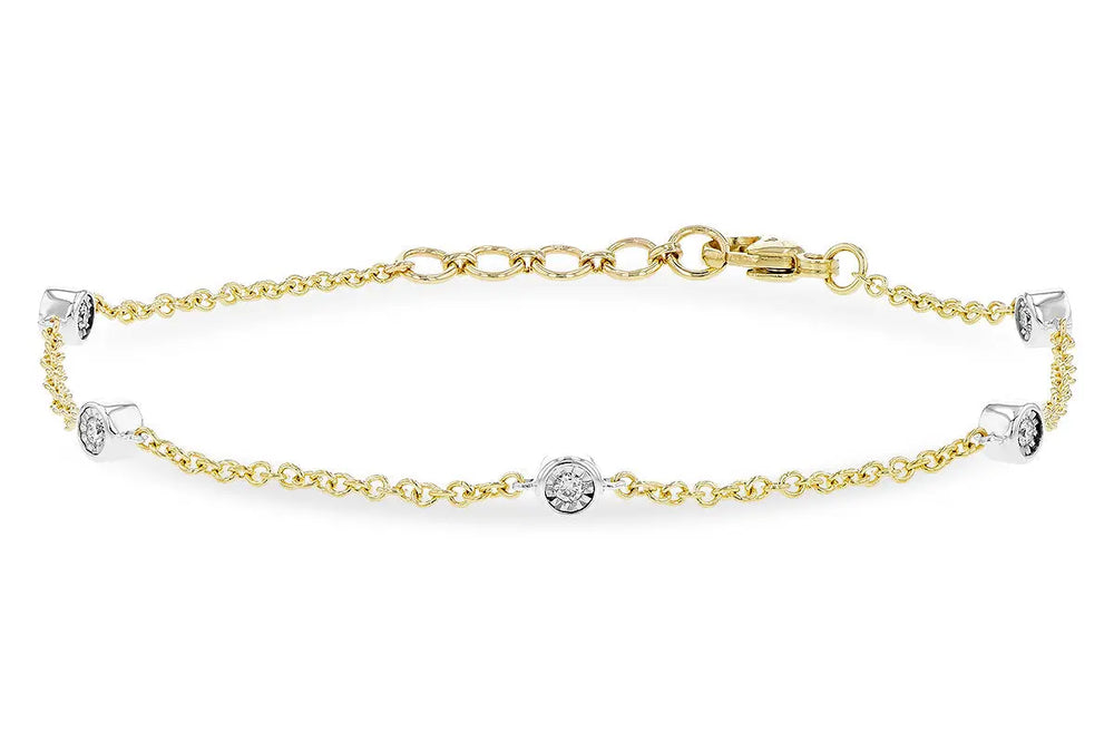 Add a touch of elegance to your wrist with our Diamonds by the Yard Bracelet. Crafted from 14 karat yellow gold, this bracelet features 5 white gold stations adorned with bezel-set round brilliant cut diamonds totaling 0.15 carats. With an adjustable length of 7.25 inches, this bracelet is perfect for any occasion.